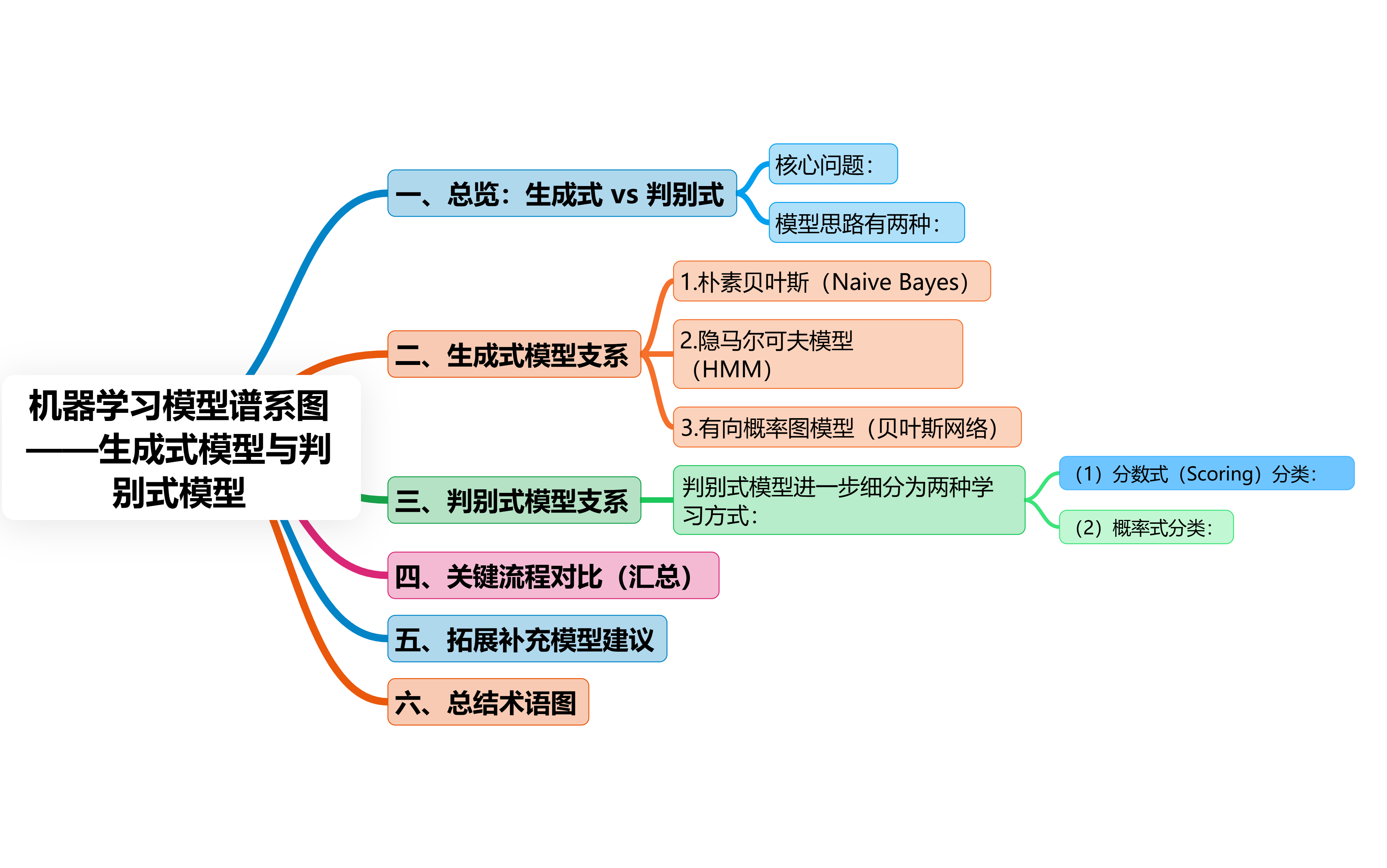 机器学习模型谱系图,聚焦于 生成式模型(Generative Models) 与 判别式模型(Discriminative Models) 的基本分类逻辑。