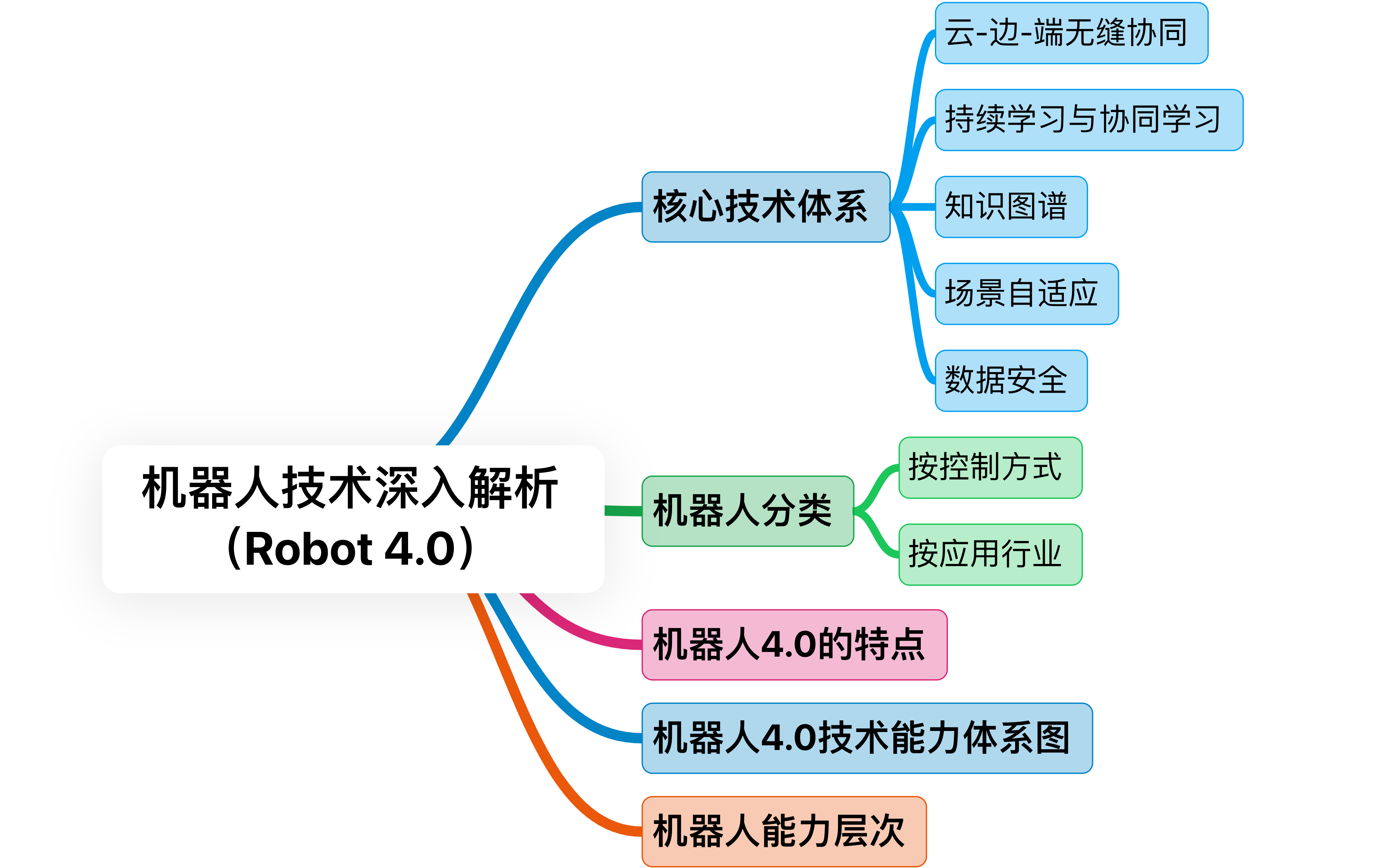 机器人技术正在迈向 4.0 时代,核心理念是云-边-端协同、智能感知、自适应学习和自主决策,实现大规模、可协作、可自适应的服务机器人部署。