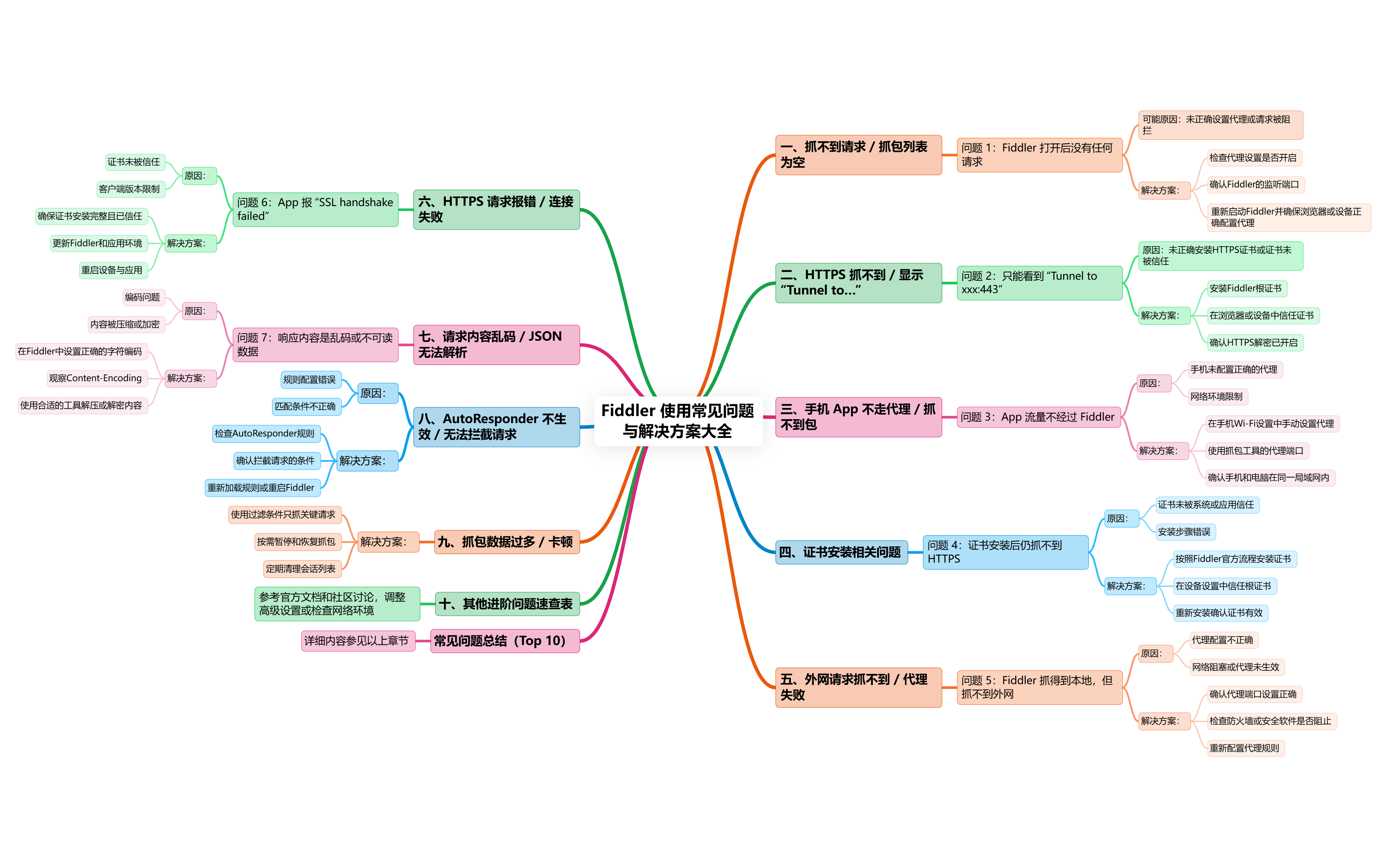 Fiddler 使用常见问题与解决方案大全,涵盖了从基础配置到 HTTPS 解密、手机 App 抓包、证书问题、代理异常等 90% 开发/测试人员都会遇到的坑,适用于 Fiddler Classic 免费版