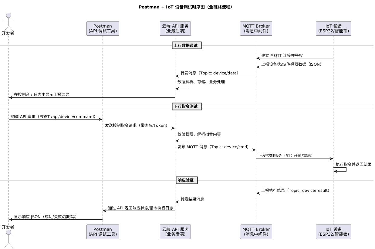 适用于典型的 IoT 场景(比如 ESP32 智能锁 / 网关设备 + 云端服务 + API 调试工具),完整展现了从设备上报到云端、Postman 模拟客户端请求、云端下行指令到设备执行的全过程。
