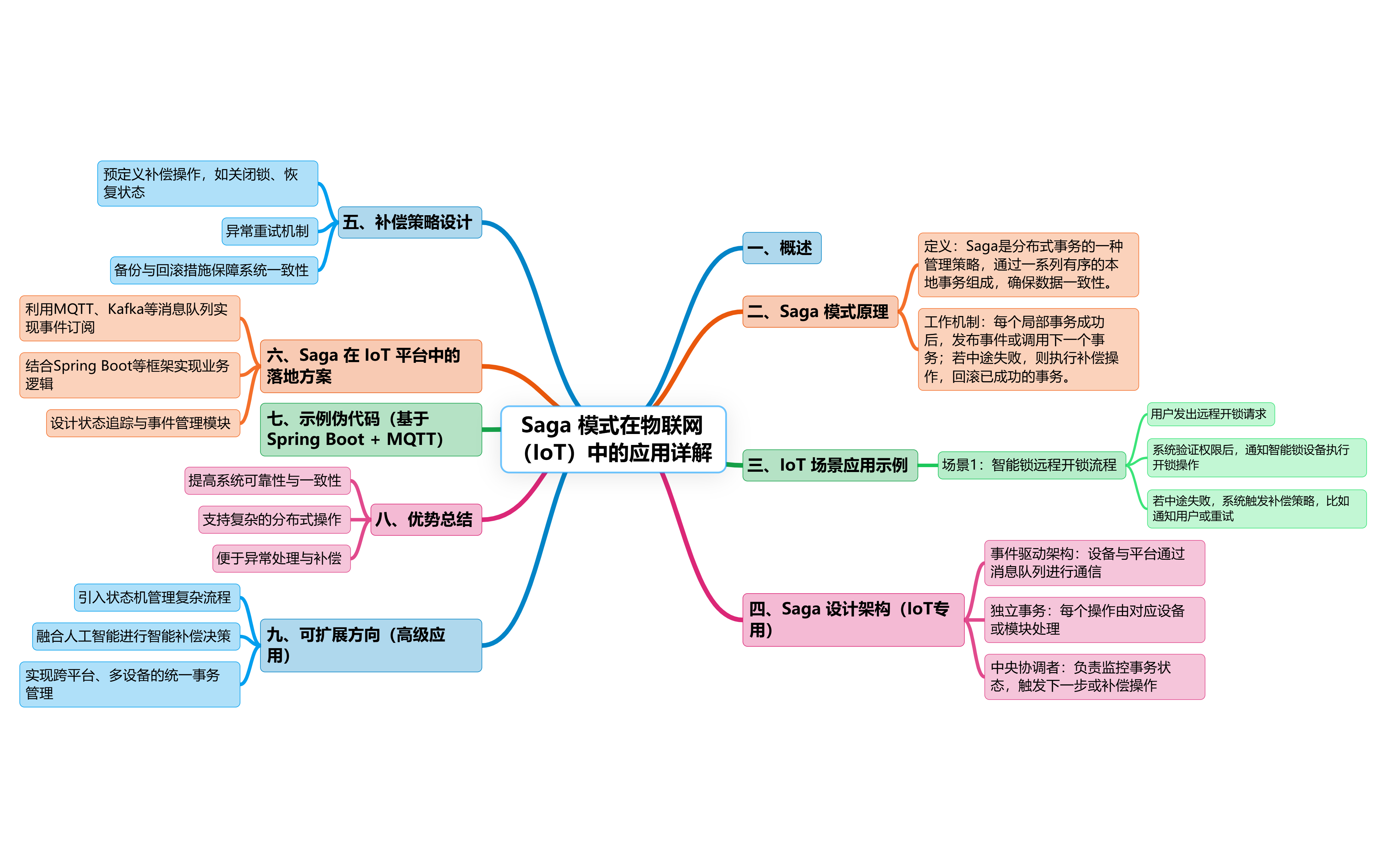 因此,Saga 模式非常适合 IoT 场景,通过将长事务拆解为一系列 本地事务 + 补偿操作 来保证系统的最终一致性。