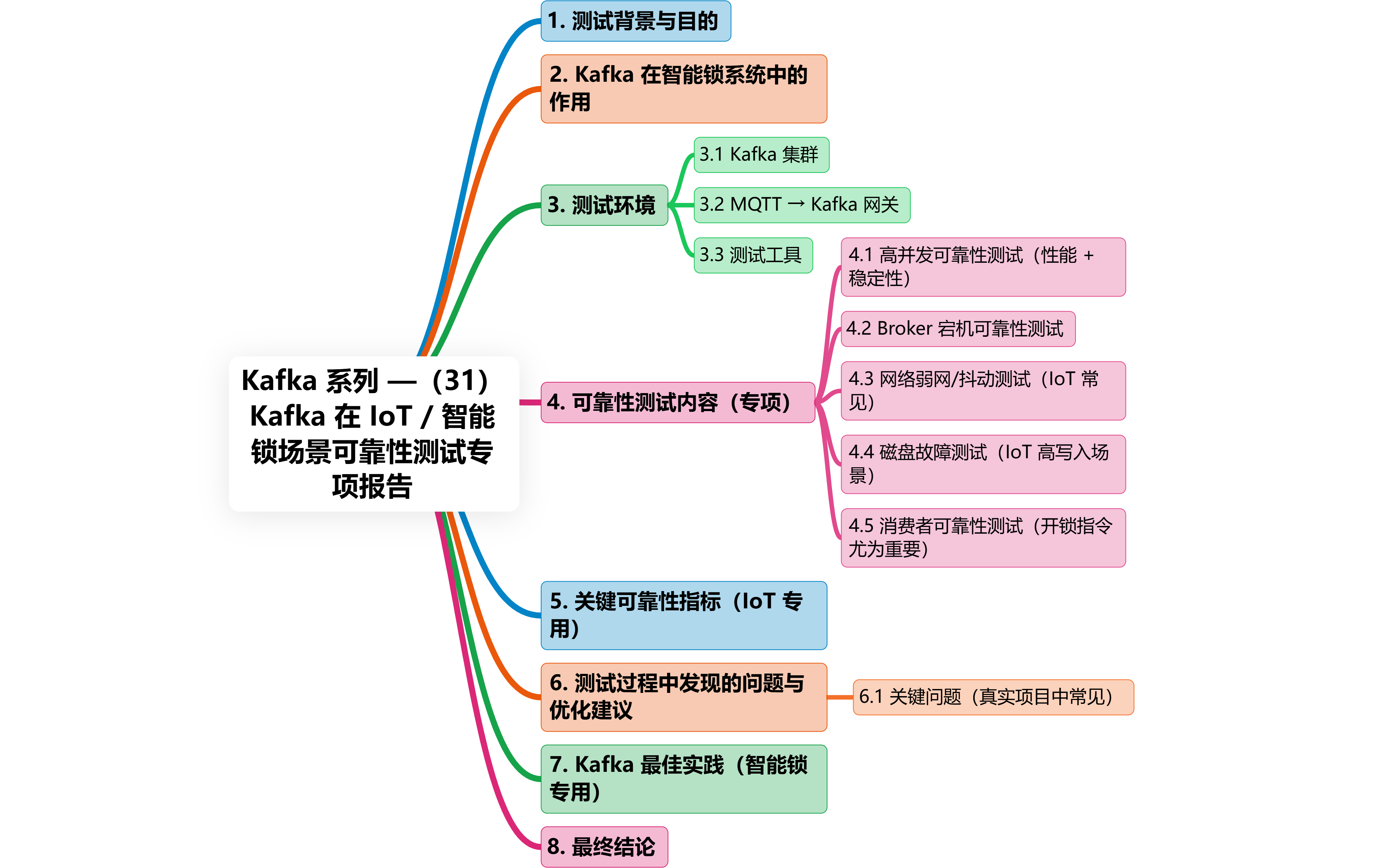 报告覆盖:测试背景、智能锁业务特点、Kafka 架构适配性、测试环境、压测模型、故障注入、可靠性指标、问题分析、结论与建议。