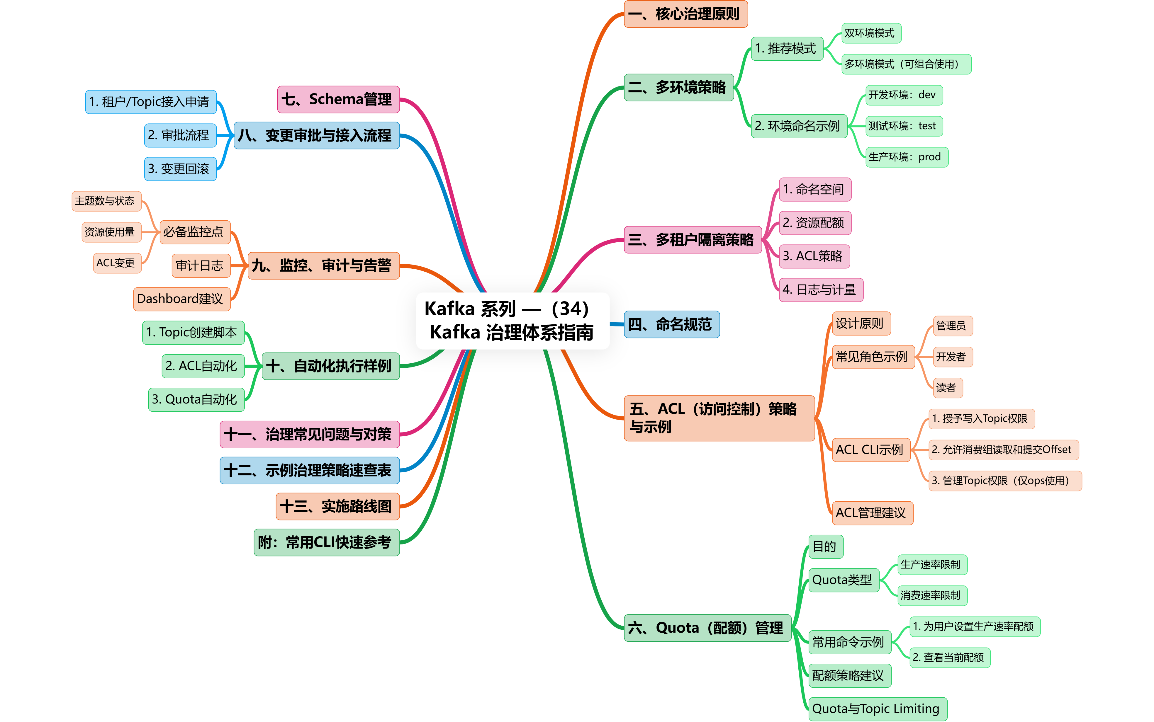 Kafka 治理体系指南(适用于企业级 / IoT / 智能锁场景),覆盖:多环境策略、多租户隔离、命名规范、ACL 权限控制、Quota(配额)管理、审批/接入流程、监控与审计、自动化执行样例与常用 CLI 片段。目标是把 Kafka 集群从“野生”变成“可控、可审计、可扩展”的平台级服务。