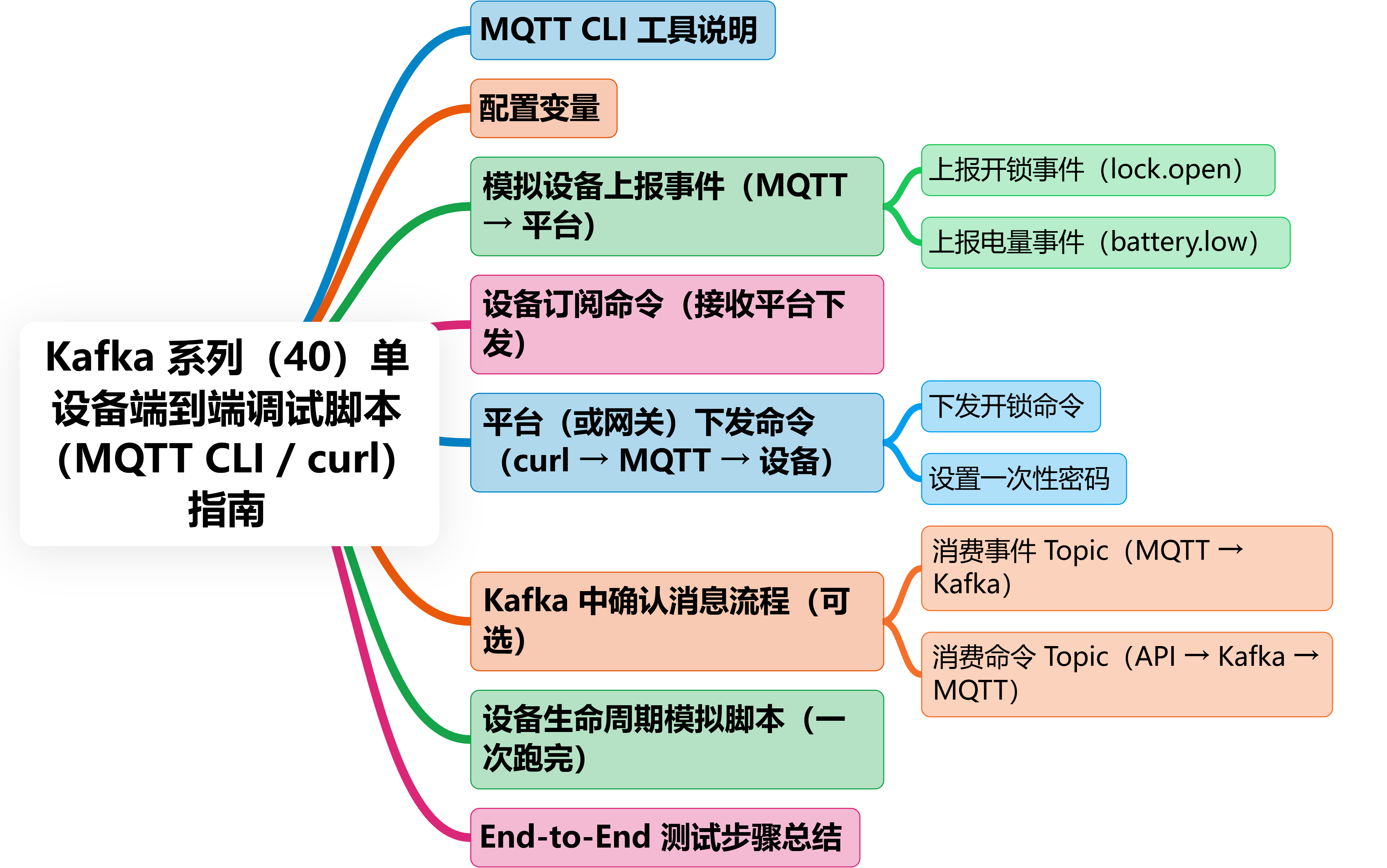 「单设备端到端调试脚本(MQTT CLI / curl)」 ——适合 智能锁 / IoT 设备 调试,涵盖 设备发消息 → MQTT → 网关 → Kafka → API → 下发命令 的完整链路。