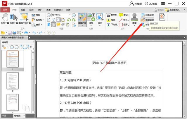 第二步、打开文档后,选择工具栏中的“开始”-“创建链接”。