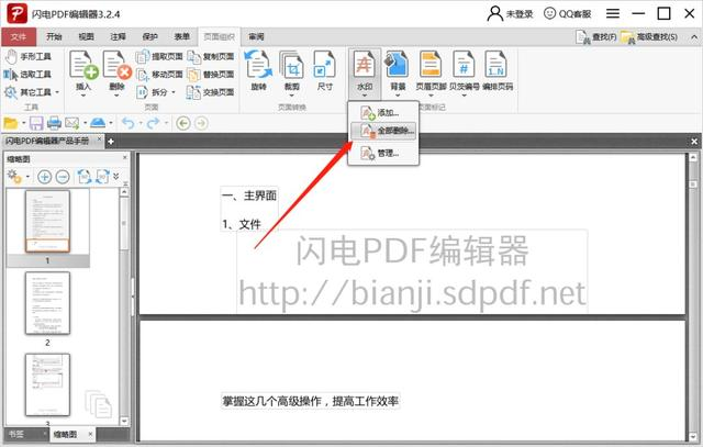 第二步、打开文档后,在工具栏中选择”页面组织“-”水印“-”全部删除“。