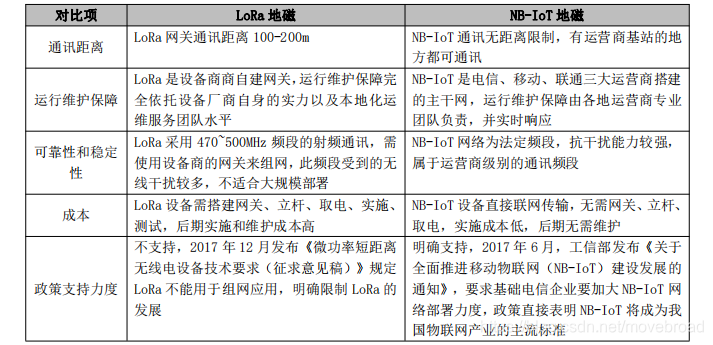 下图对LoRa通讯与Nbiot通讯的各性能进行对比