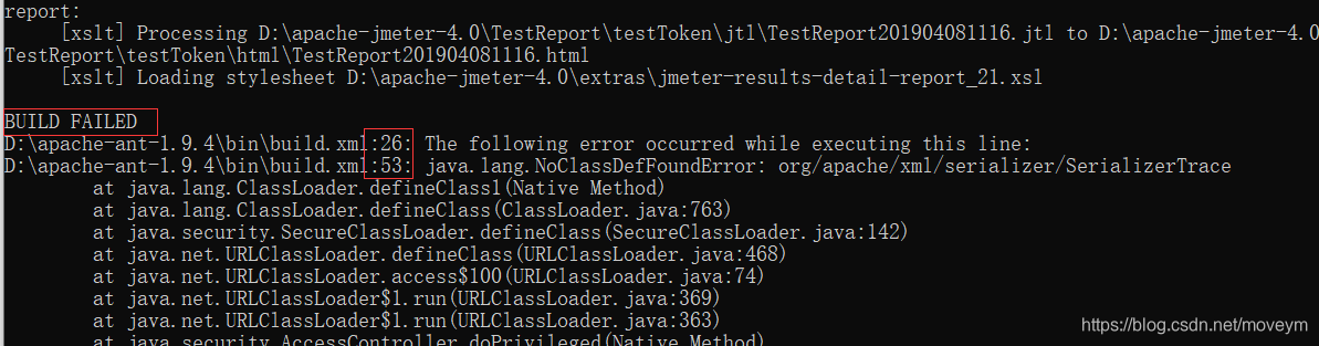 把jmeter4.0 lib下的“xalan.jar,serializer.jar”复制到 ant 下的lib 目录 重新运行,问题解决。