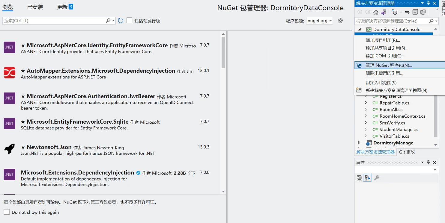 1.在asp .net core的数据访问层中依赖项右键打开 管理NuGet程序包