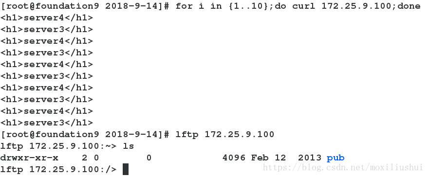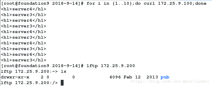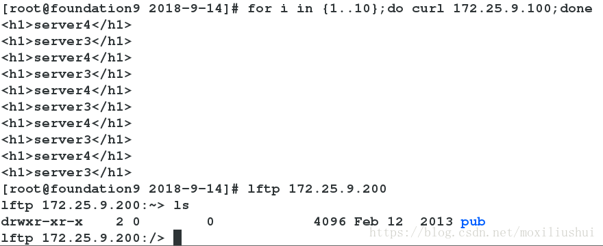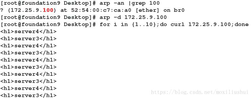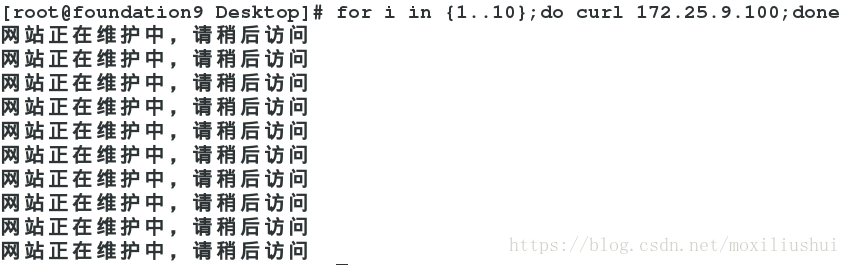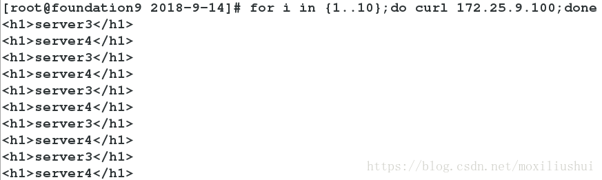 在物理机中for i in {1..10};do curl 172.25.9.100;done查看轮询结果