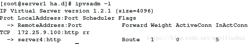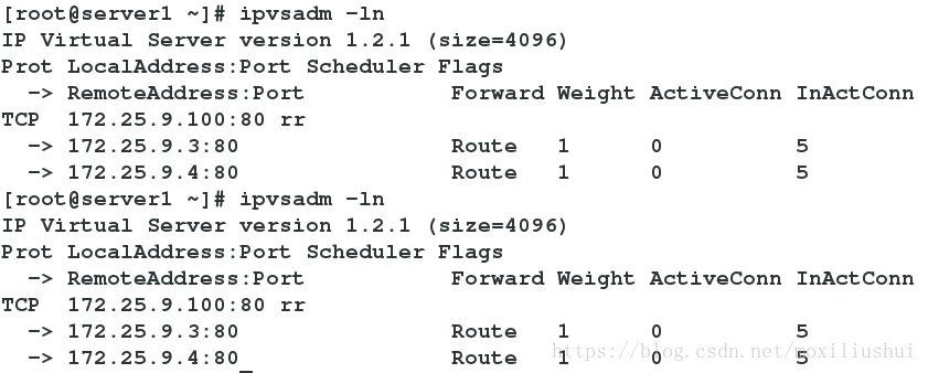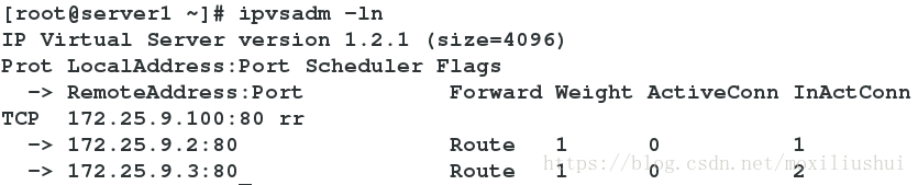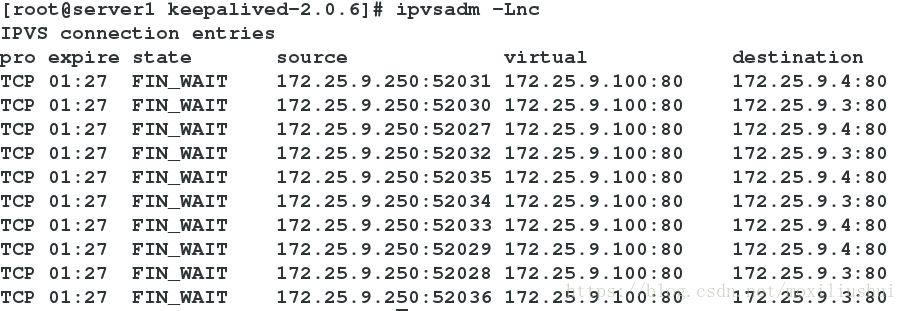 但是此时在server1中 ipvsadm -ln 可以发现随着物理机访问172.25.9.100失败次数增多