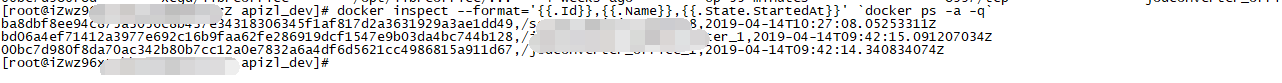 docker inspect --format='{{.Id}},{{.Name}},{{.State.StartedAt}}' `docker ps -a -q`