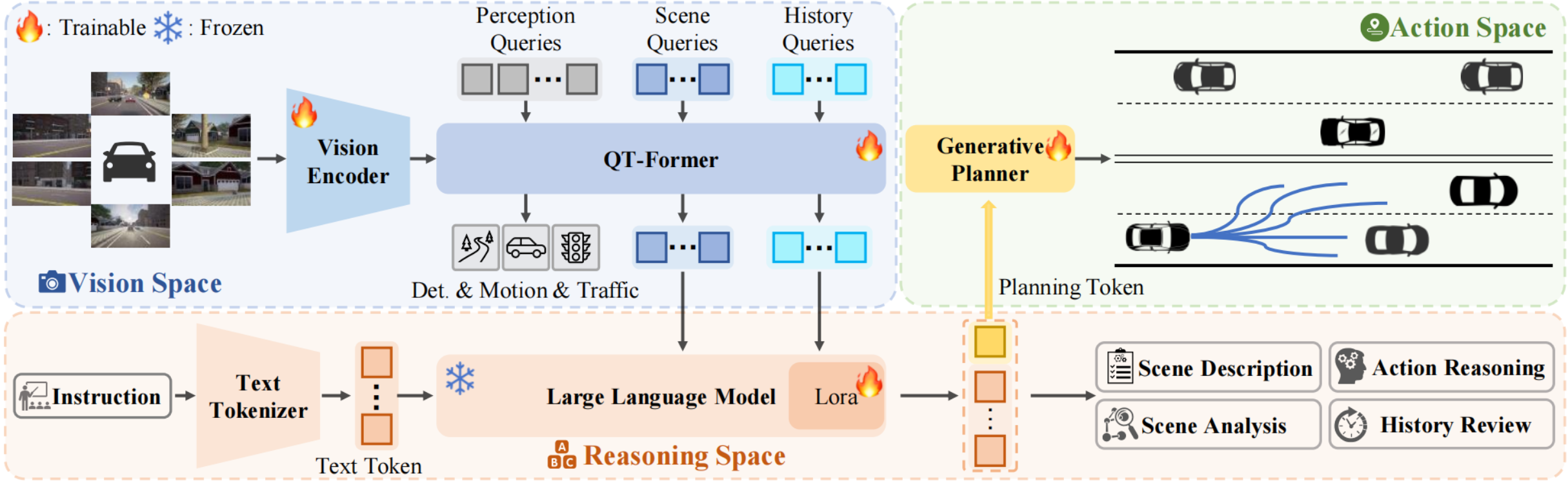 ORIN在使用视觉感知监督训练检测、地图和预测任务同时,增加了场景的历史信息储存和查询,增加对自动驾驶场景的空间理解能力。通过VAE对齐规划的文本空间和行动空间,增加轨迹的生成能力。