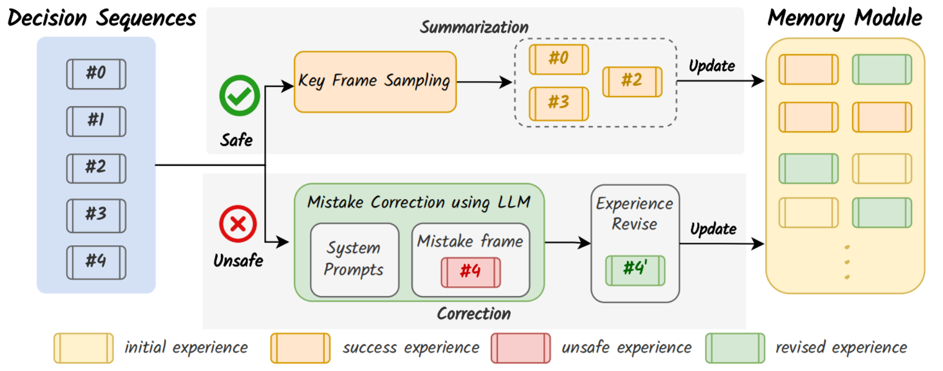 - 当LLM做出正确决策或者通过Reflection模块修正决策后,将当前场景文本描述嵌入向量作为key,与推理过程配对存储到Memory模块;