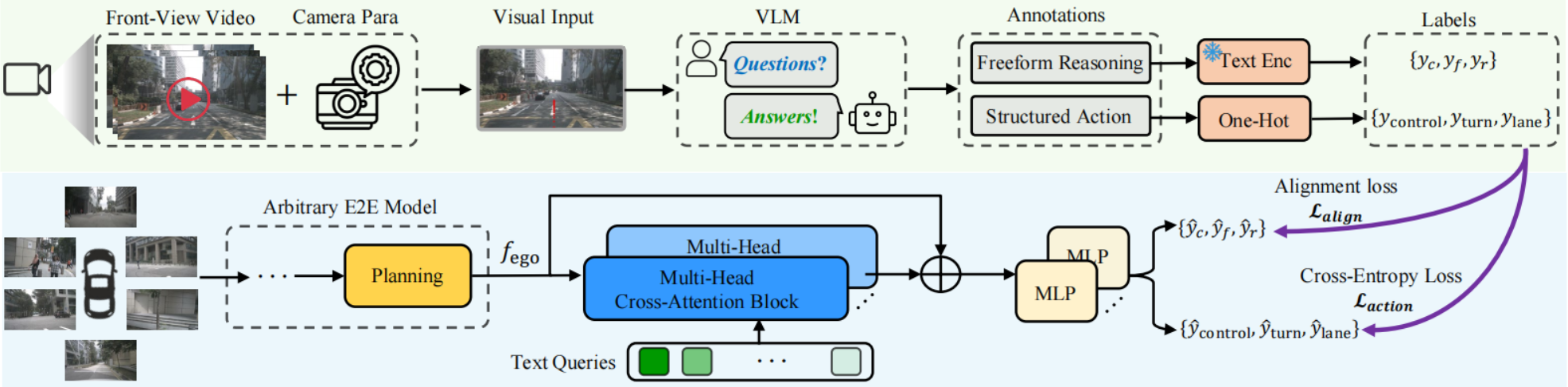 VLMs在线推理耗时,因此VLM-AD将VLMs作为teacher,先离线生成推理标注,再通过辅助任务对E2E模型进行辅助监督训练,可以使E2E学习到推理过程。并且是一种通用插件,不会修改原E2E模型,并且在推理过程中无需VLMs。