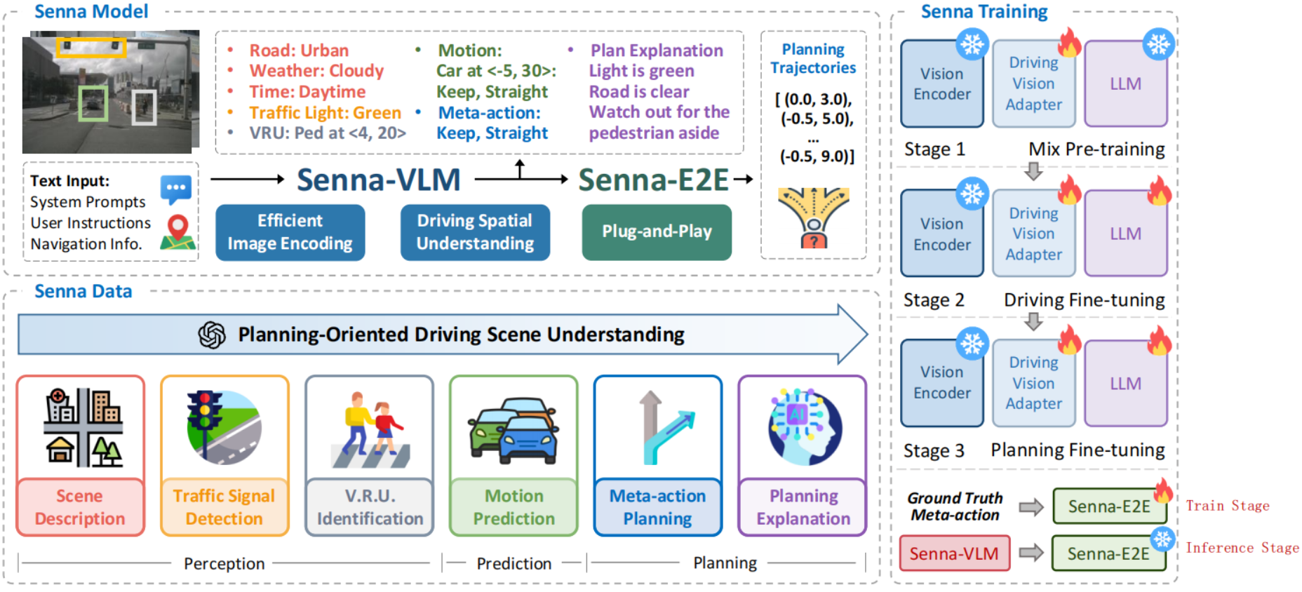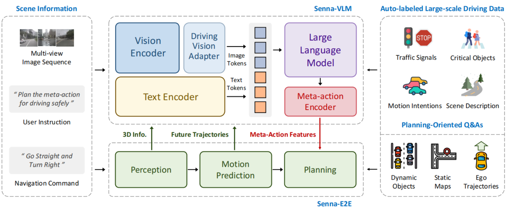 - Planning Fine-tuning: Vision Encoder 保持冻结,使用仅 meta-action QAs 对 Senna-VLM 进一步微调,提升高层规划能力。