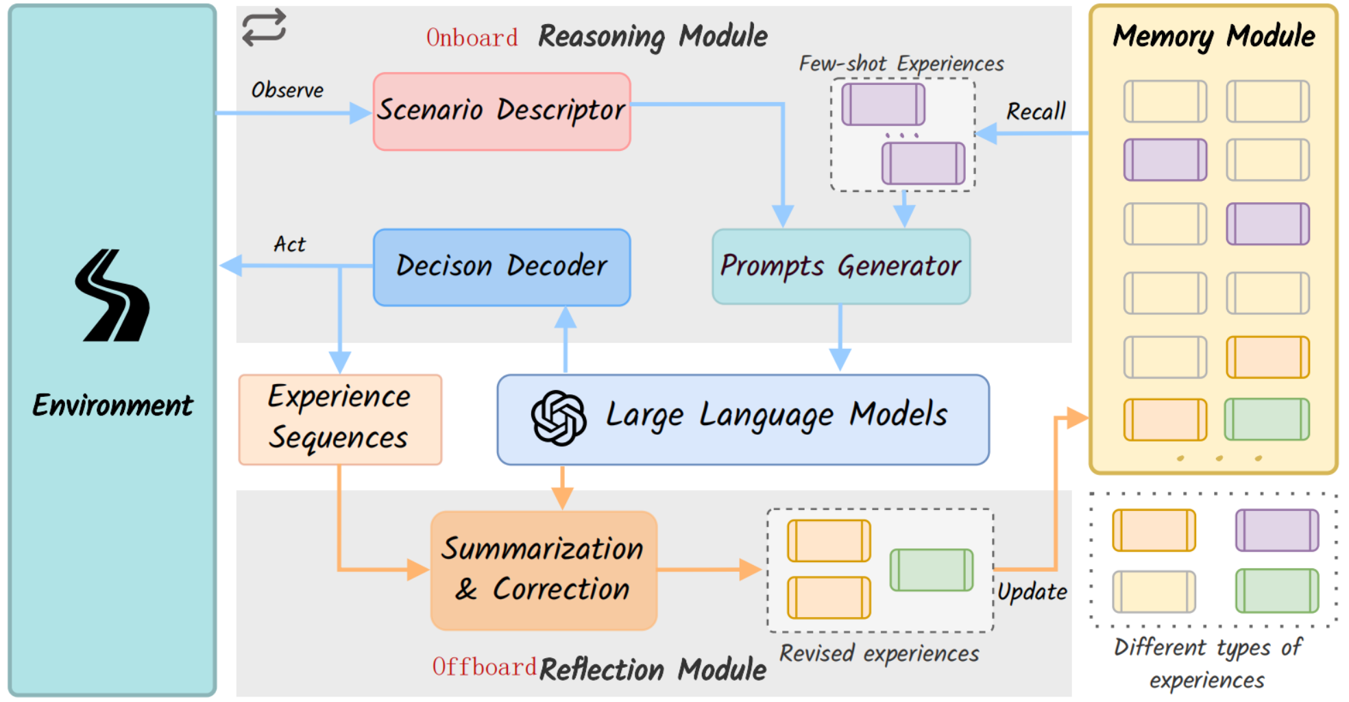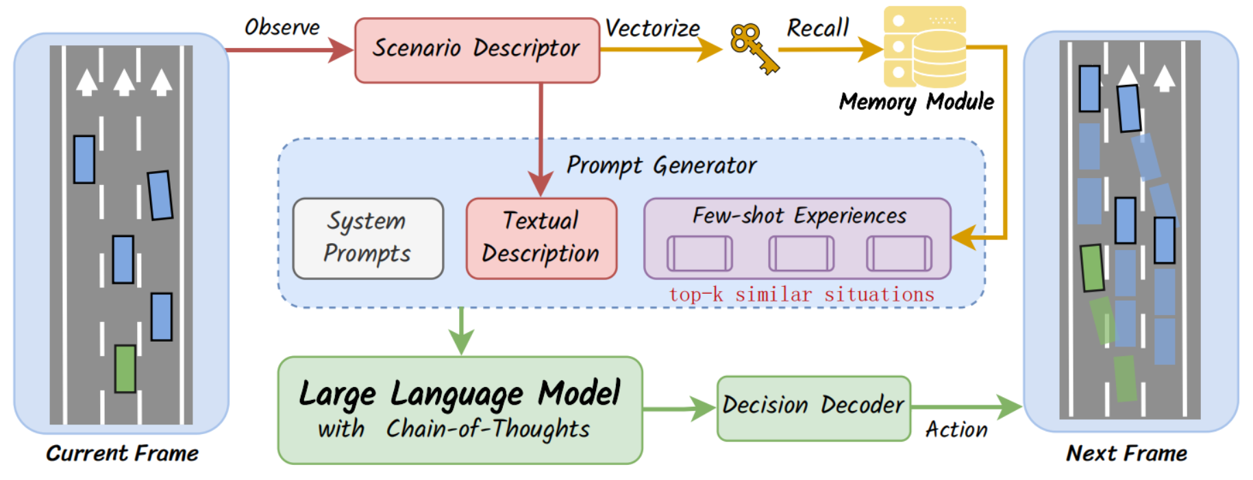 - 检索经验:将场景描述文本嵌入向量,在Memory中搜索Top-k最相似场景,拿到他们的场景描述和推理过程,作为few-shot experiences,帮助LLM参考过去经验;