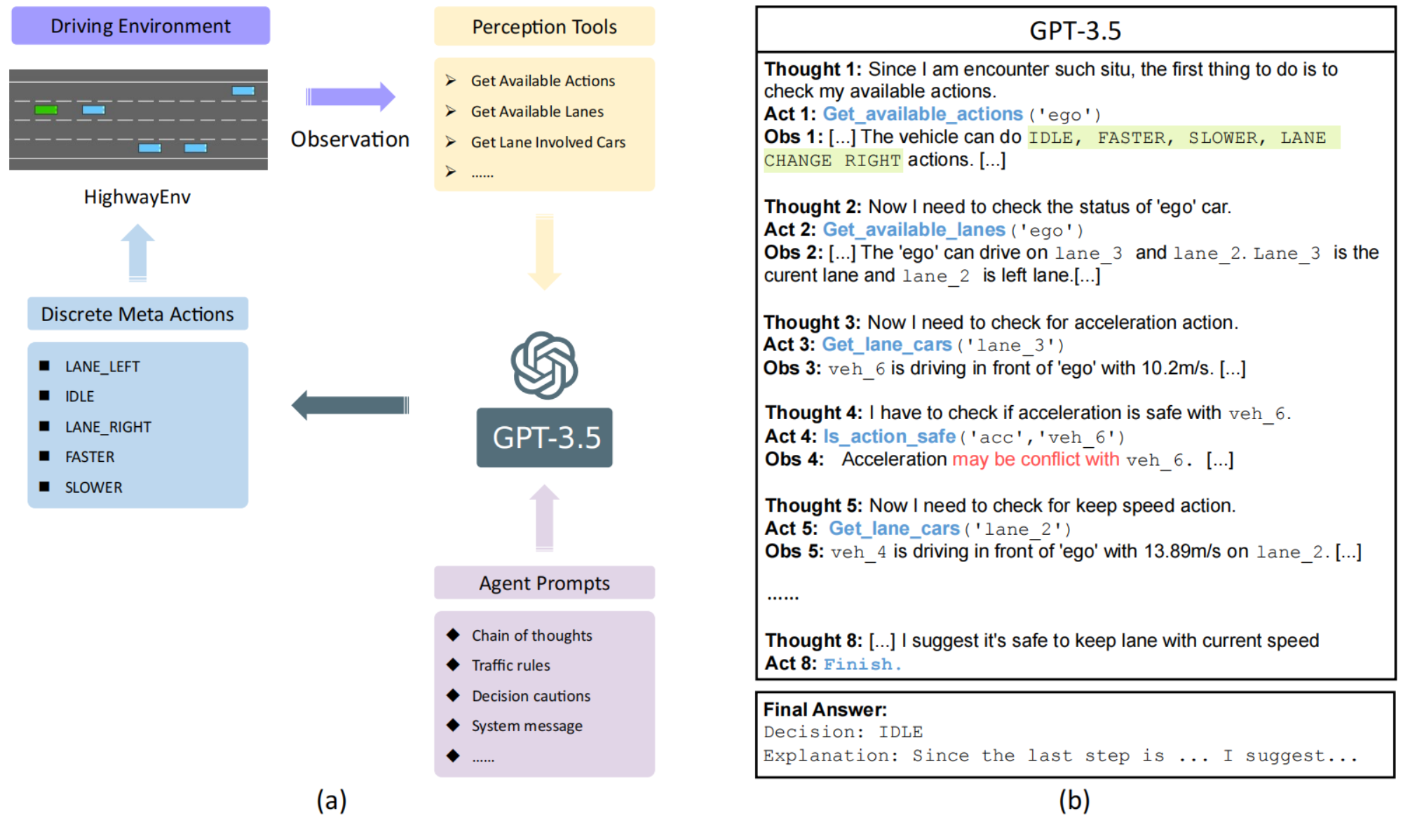 GPT-3.5是文本模型,无法直接操作仿真环境,因此使用LangChain(大语言模型应用开发框架),调用Percaption Tools,根据Agent Prompts使用ReAct(Reasoning+Acting)策略,在”思考(Thouhgt) →行动(Action)→观察(Observation)“循环中分析周围环境,进行决策,生成预定义的决策(Discrete Meta Actions)。
