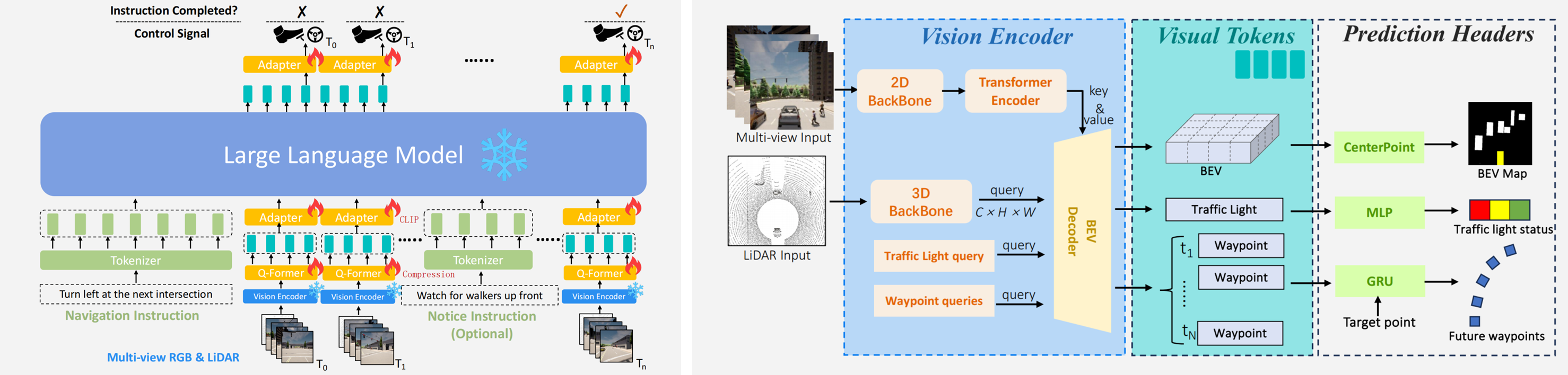同样的通过BEV感知增加3D空间理解能力,使用CLIP对齐的文本空间,然后对LLM预测轨迹解码。