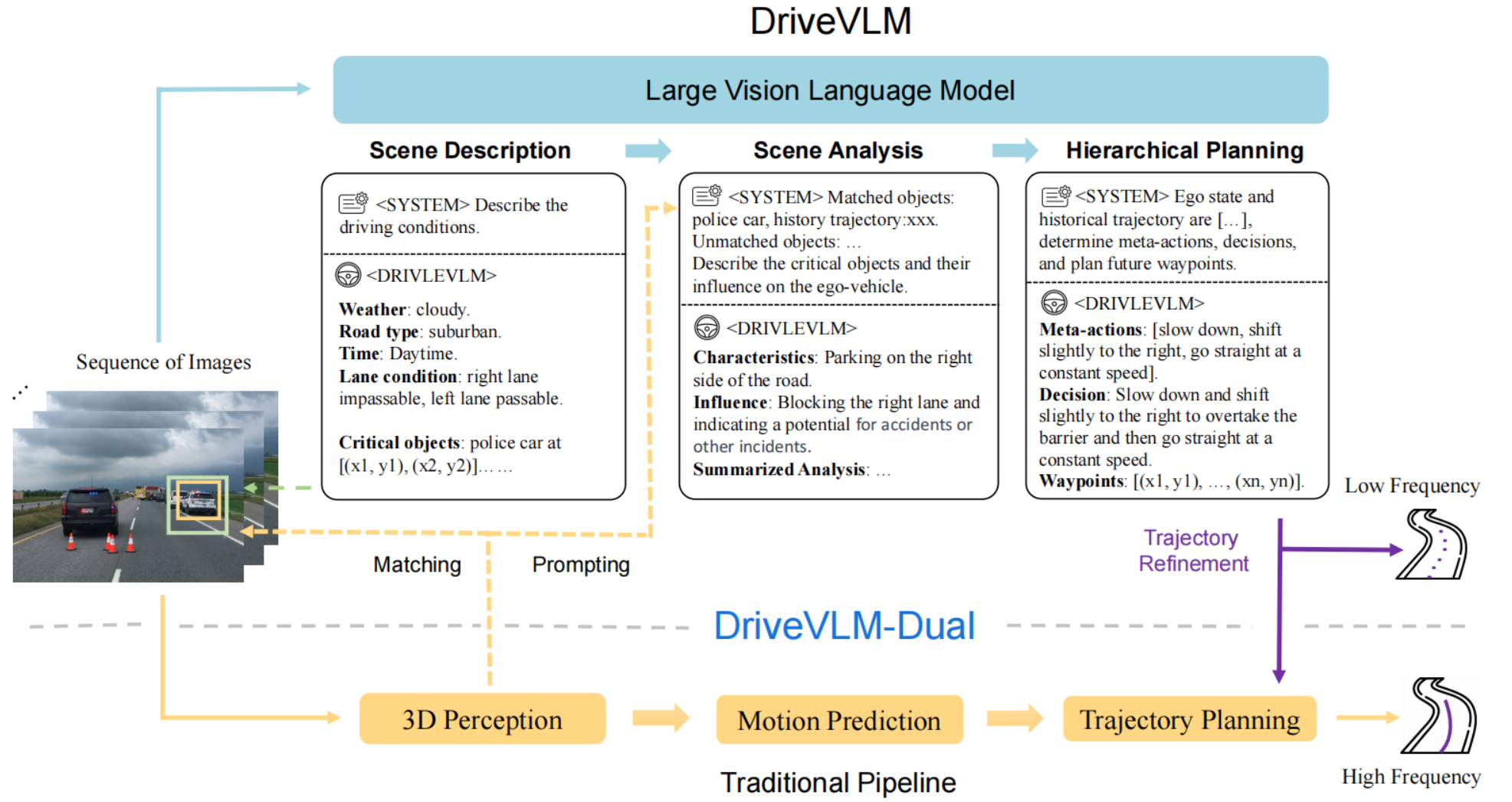 - 快慢双系统设计,如果是规则+优化方法,DriveVLM输出参考轨迹给轨迹优化器。如果是和E2E方法结合,则输出参考轨迹的token。