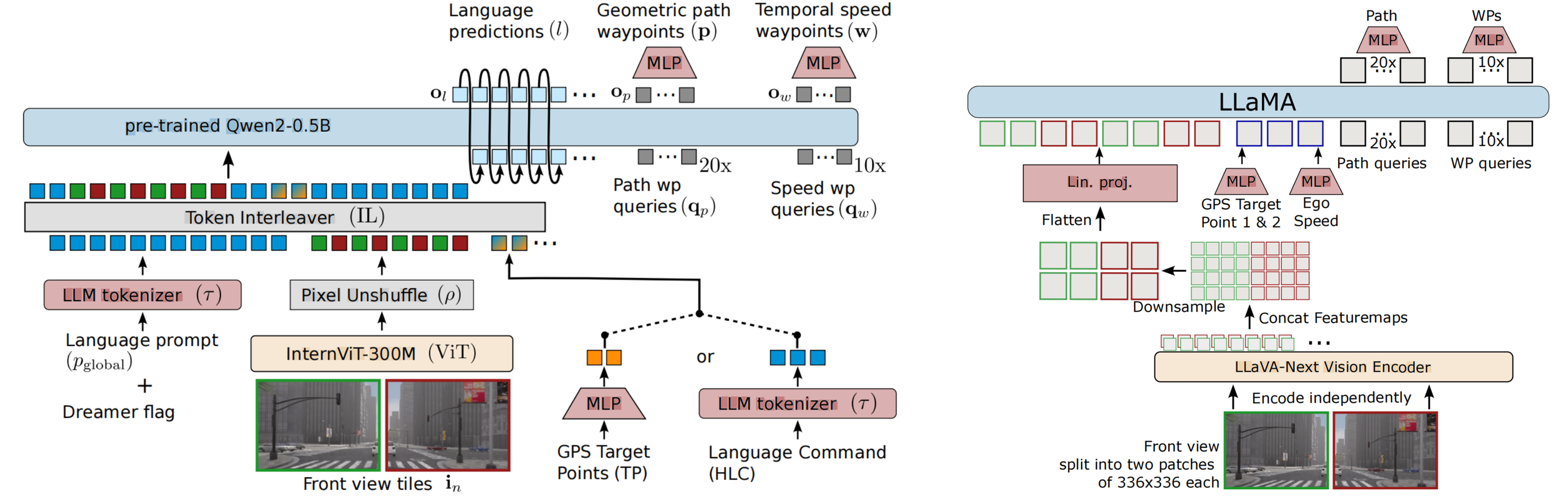 两个工作都是Wayve和图宾根大学合作的,显然采用了一样的思路和架构。将前视图像编码后降采样,对齐到文本空间,然后根据Prompt排序不同模态的输入给LLM,增加MLP解码path和speed。更加像在VLMs的工作上增加了Instruction-Action训练和Action Decoder。