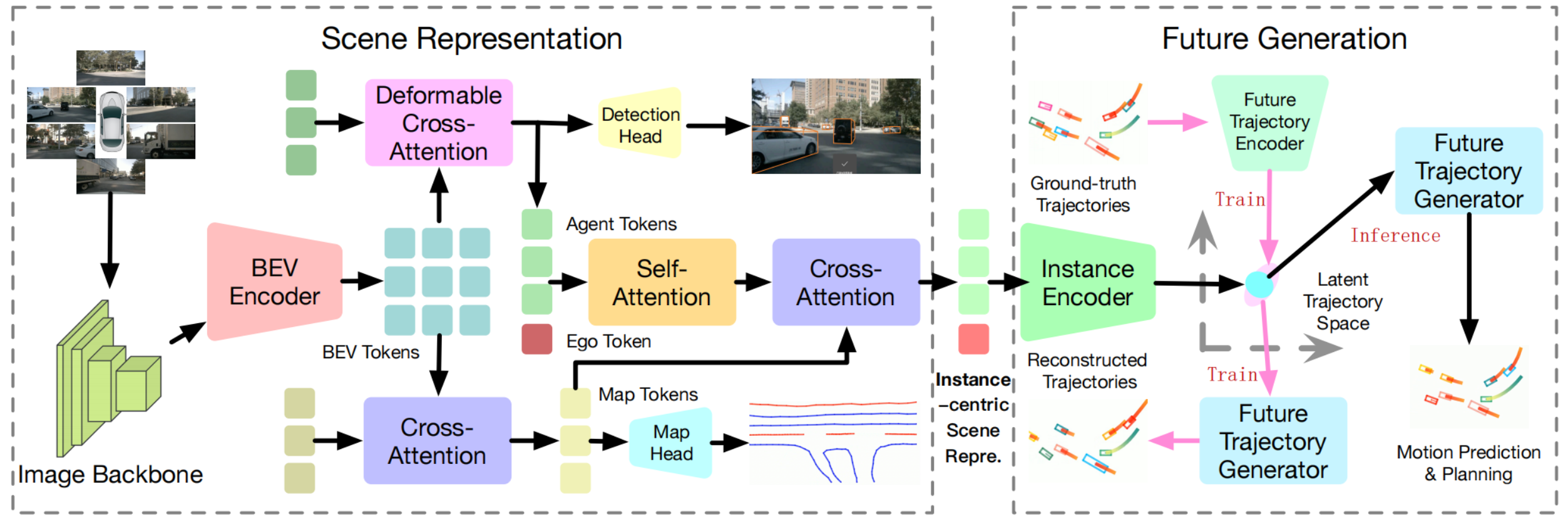 - Train:所有模块一起训练(可以pre train perception),各个模块都训练显式监督训练。在推理阶段,丢弃掉对真实轨迹的编码和解码。