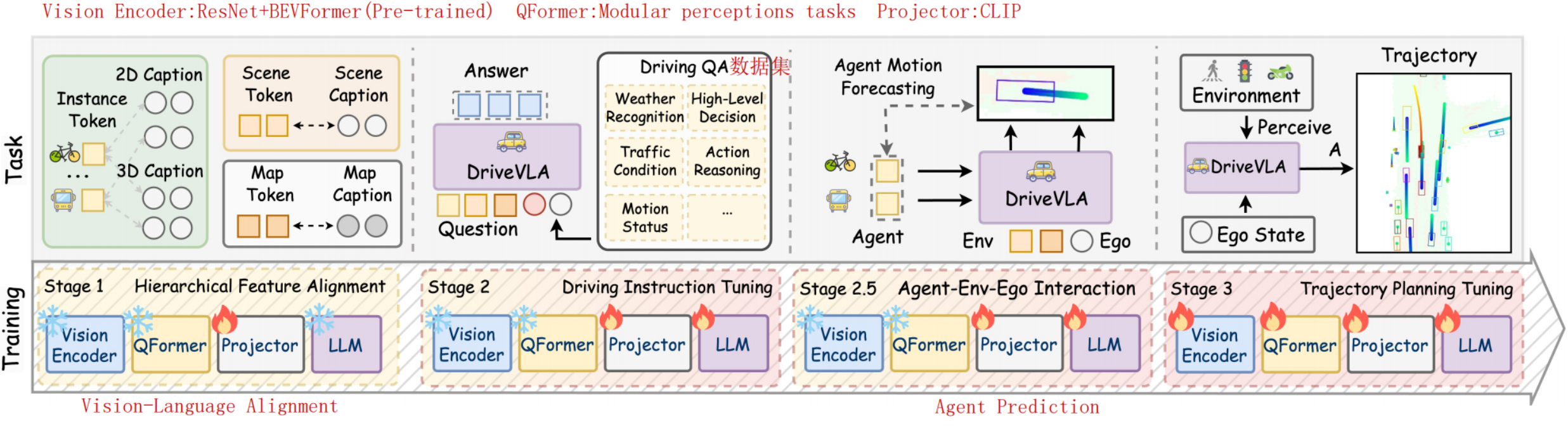- Vision encoder pre-training stage:BEV感知,通过监督学习训练;