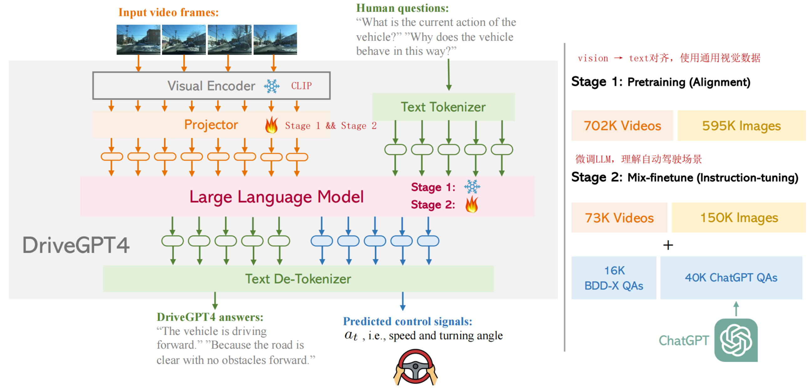 从架构中可以看到,video会抽帧image,使用预训练的CLIP编码,N帧图像再映射到文本空间,这个Projector在训练的第一个阶段使用通用视觉数据对齐到文本。在第二个训练阶段和LLM一起微调,使用自动驾驶数据,使LLM理解自动驾驶场景。