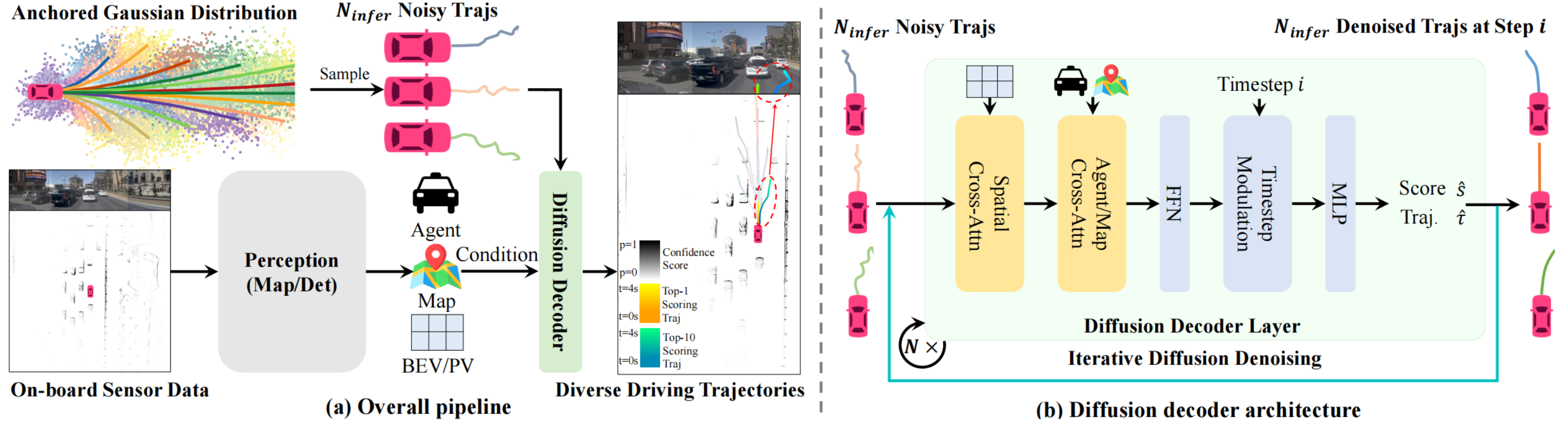 DiffusionDrive使用”perception -> planning“的pipeline,perception遵循的以往的设计范式,在planning模块使用了扩散模型表达驾驶行为的不确定性和多模态特性。由于扩散模型从高斯分布的随机噪声去噪过程计算耗时,且生成轨迹高度近似,DiffusionDrive通过Anchored Gaussian Distribution,使用人类驾驶数据集聚类生成锚点轨迹,只加少量噪声,然后再去噪,步数少,速度快,并且保持了轨迹的多样性。