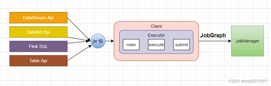 Client在接收到提交的Flink应用(一些JAR包)后,会找到JAR包中的 Main 方法,创建Flink运行环境,把数据流图 DataFlow Graph 转化为 JobGraph (DAG有向无环图表示的作业),连通JAR包一起提交给Flink集群的 JobManager,