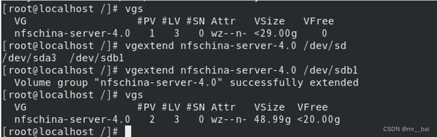 六、将添加新的物理卷,加载到centos卷组,使用vgextend centos /dev/sdc1命令。再次查看逻辑卷组信息, PV 从 1 变成了 2