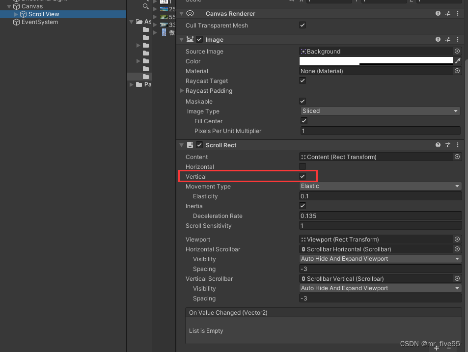 调整Content Size Fitter组件中的Horizontal Fit 或 Vertical Fit,可以设置Scroll View组件目录下的Content组件Rect的宽高,可实现根据子对象自动适应宽高,从而实现滚动。如上图设置可以自动适应子对象的高度。