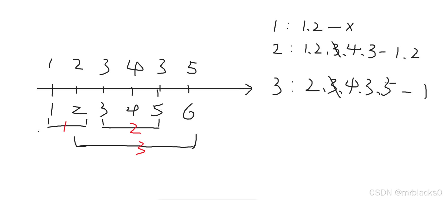 第二次询问[3,5] 0-5上有1,2,3(后面又出现3,就要把他之前的贡献删去,否则会重复累加),4,3数字 对数量有1的贡献,0-2 有数字1,2 那么答案就是2;