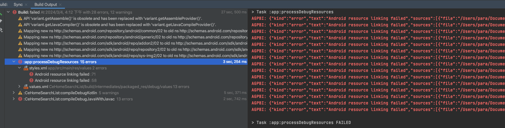 AGPBI: {"kind":"error","text":"Android resource linking failed","sources":[{"file":"/Users/para/Documents/ershouji_proj/ershouji_NEW/CeHomeSea
