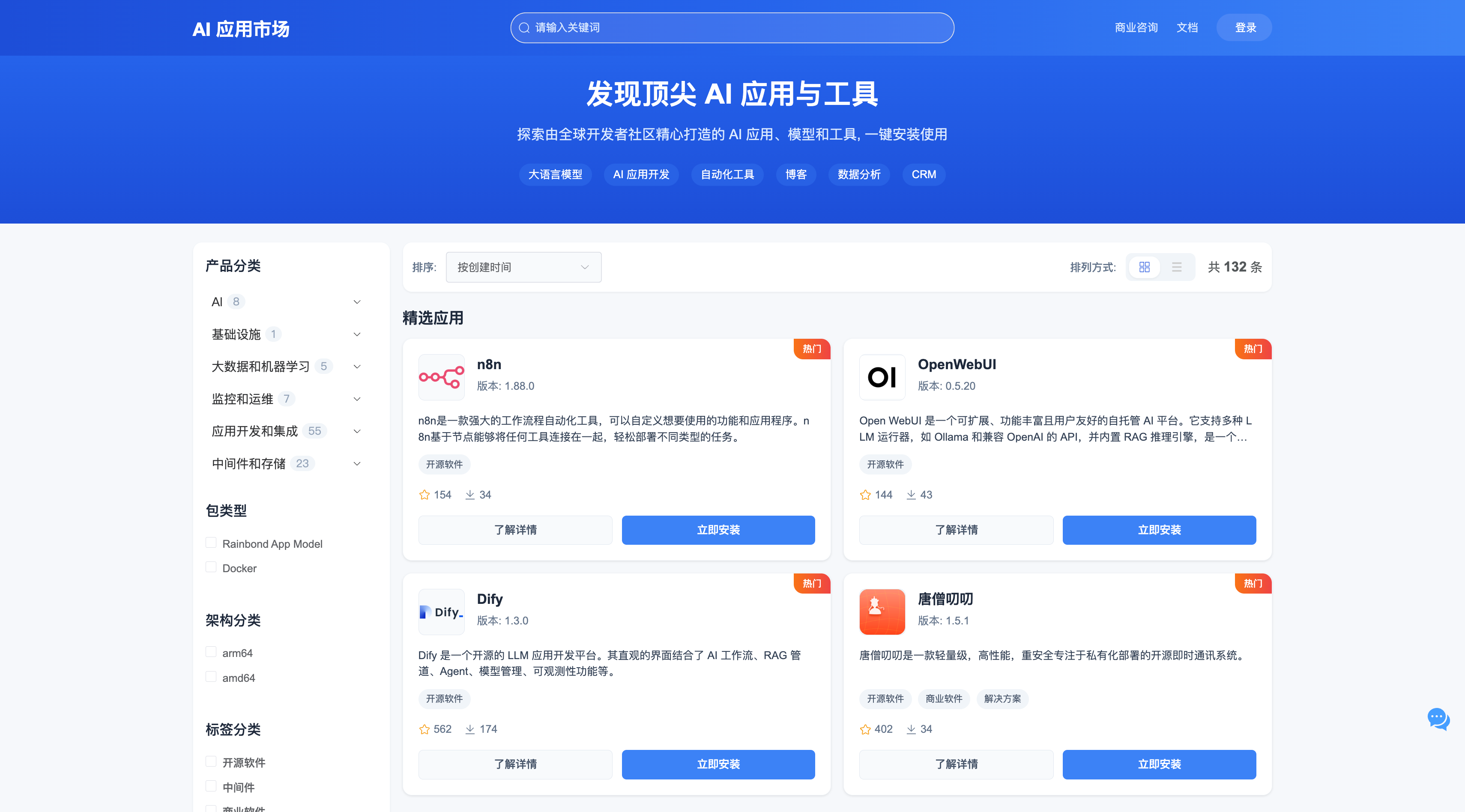 AI 应用市场是各类开源软件的宝藏汇聚地,里面涵盖了 AI、博客、运维、CRM、ERP 等多种类型的应用。在这里,你能轻松找到各种实用工具,所有应用均提供免费使用服务,享受即点即用的便捷体验。