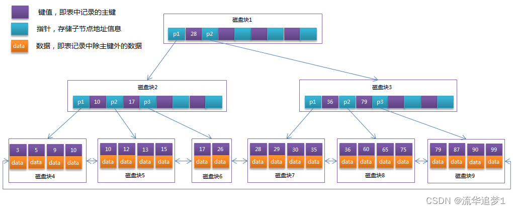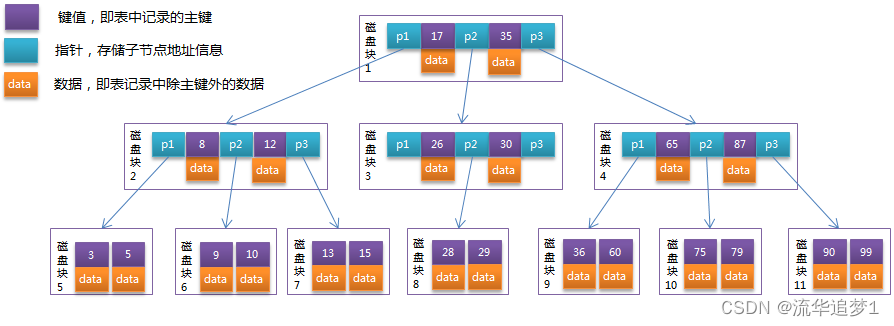 每个结点占用一个盘块的磁盘空间,一个结点上有两个升序排序的关键字和三个指向子树根结点的指针,指针存储的是子结点所在磁盘块的地址。两个关键词划分成的三个范围域对应三个指针指向的子树的数据的范围域。以根结点为例,关键字为17和35,P1指针指向的子树的数据范围为小于17,P2指针指向的子树的数据范围为17~35,P3指针指向的子树的数据范围为大于35。