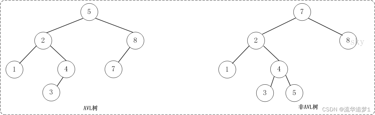 平衡二叉树(AVL树)在符合二叉查找树的条件下,还满足任何节点的两个子树的高度最大差为1。下面的两张图片,左边是AVL树,它的任何节点的两个子树的高度差<=1;右边的不是AVL树,其根节点的左子树高度为3,而右子树高度为1;