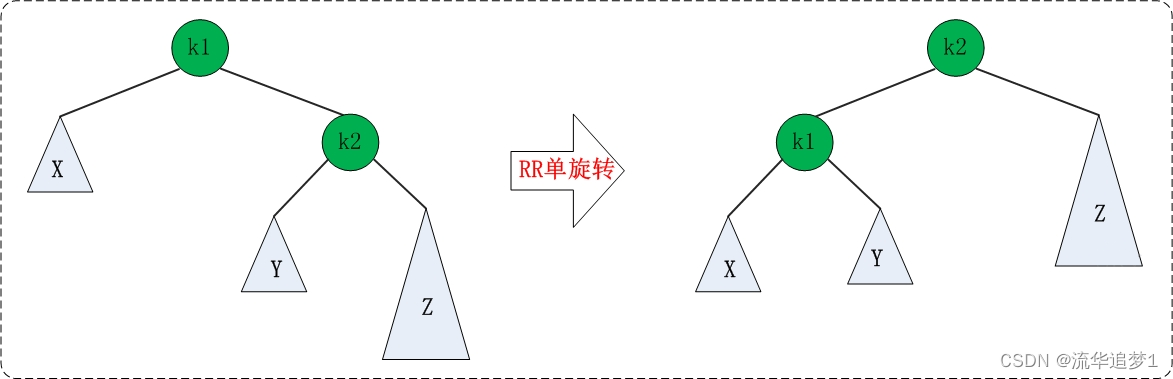 RR:RightRight,也称“右右”。插入或删除一个结点后,根结点的右孩子(Right Child)的右孩子(Right Child)还有非空结点,导致根结点的右子树高度比左子树高度高2,AVL树失去平衡。