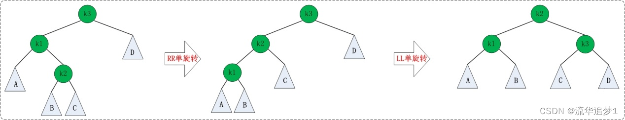 RR的旋转:RR失去平衡的情况下,旋转方法与LL旋转对称,步骤如下: