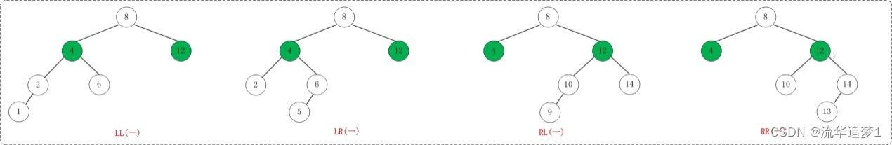 如果在AVL树中进行插入或删除节点,可能导致AVL树失去平衡,这种失去平衡的二叉树可以概括为四种姿态:LL(左左)、RR(右右)、LR(左右)、RL(右左)。它们的示意图如下:
