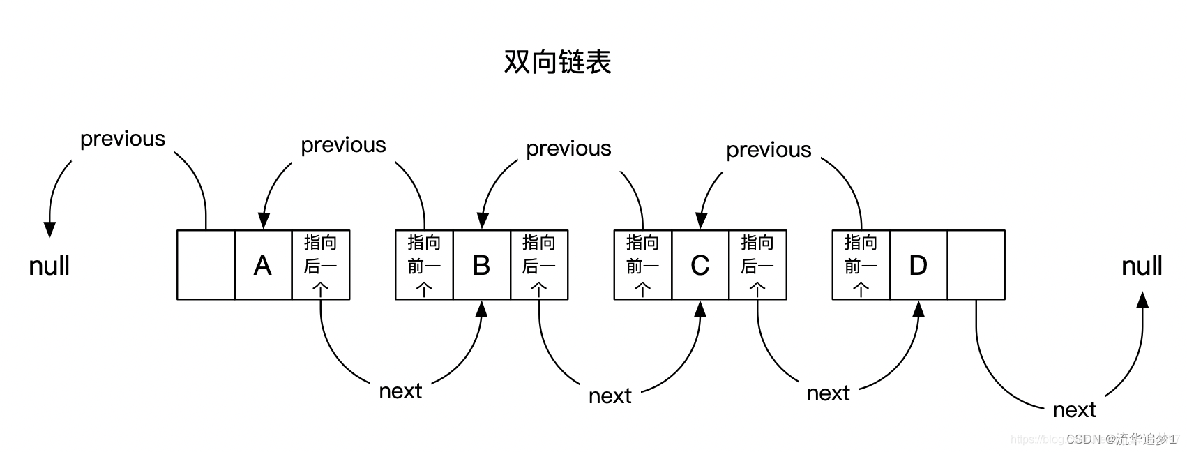 双向链表:除了元素本身之外,还有两个指针,一个指针指向前一个元素的地址,另一个指针指向后一个元素的地址;