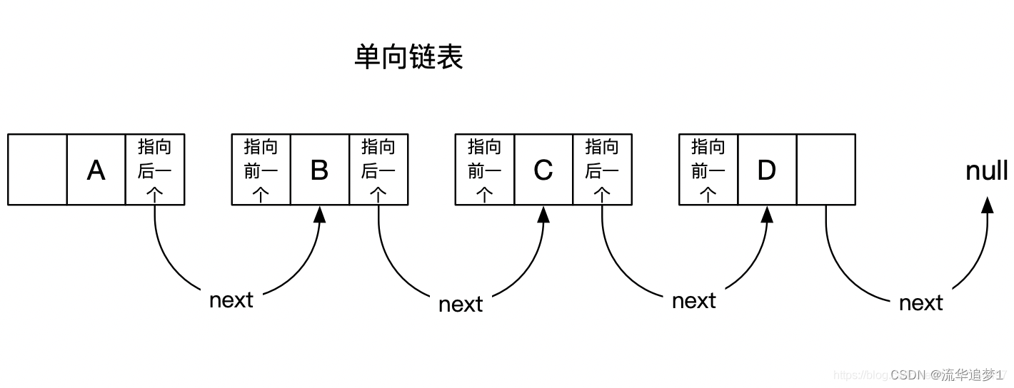 单向链表: 每个元素中除了元素本身之外,还存储一个指针,这个指针指向下一个元素;