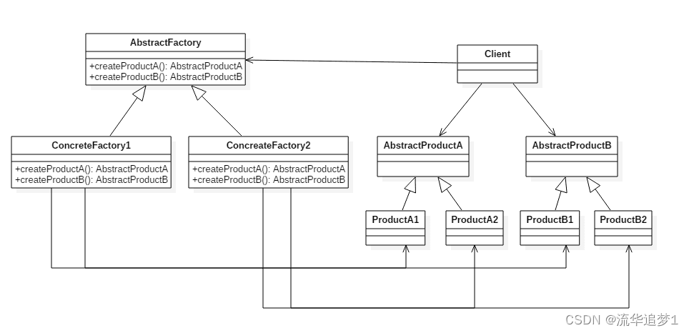 至于创建对象的家族这一概念是在 Client 体现,Client 要通过 AbstractFactory 同时调用两个方法来创建出两个对象,在这里这两个对象就有很大的相关性,Client 需要同时创建出这两个对象。