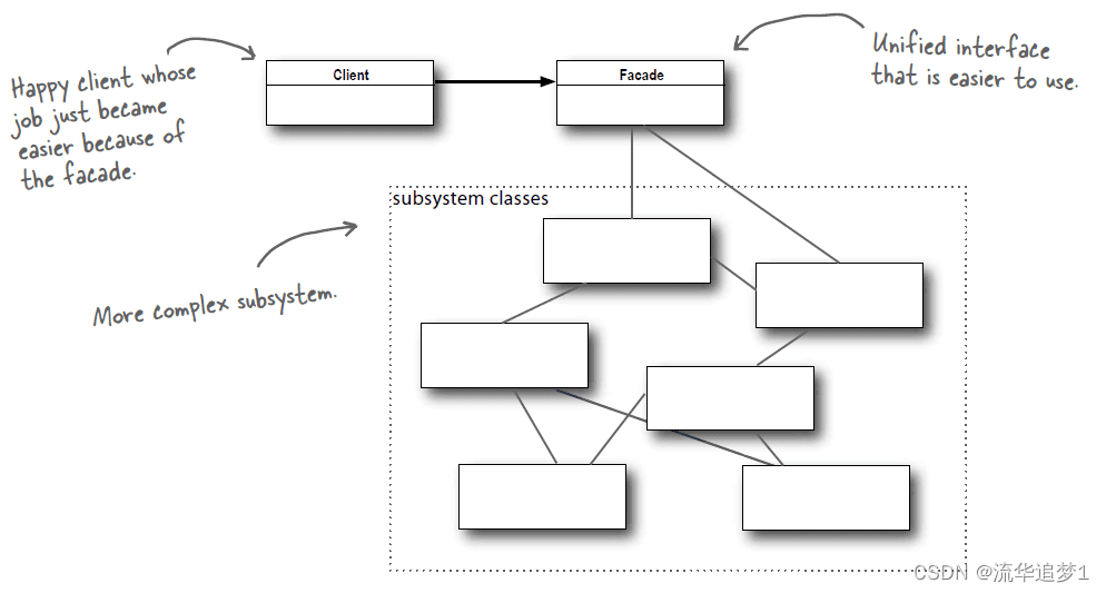 结构型 - 外观模式(Facade Pattern)又叫门面模式,它提供了一个统一的接口,用来访问子系统中的一群接口,从而让子系统更容易使用。