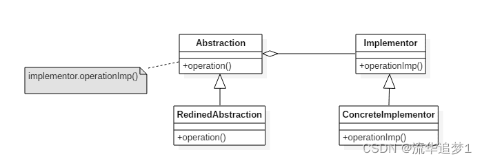 桥接模式使用“对象间的关联关系”解耦了抽象和实现之间固有的绑定关系,使得抽象和实现可以沿着各自的维度来变化。所谓抽象和实现沿着各自维度的变化,也就是说抽象和实现不再在同一个继承层次结构中,而是“子类化”它们,使它们各自都具有自己的子类,以便任何组合子类,从而获得多维度组合对象。