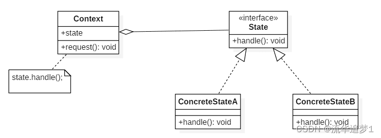 ConcreteState 具体的状态角色,每个子类实现一个与Context 的一个状态相关行为。