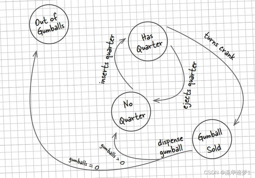 案例:糖果销售机有多种状态,每种状态下销售机有不同的行为,状态可以发生转移,使得销售机的行为也发生改变。