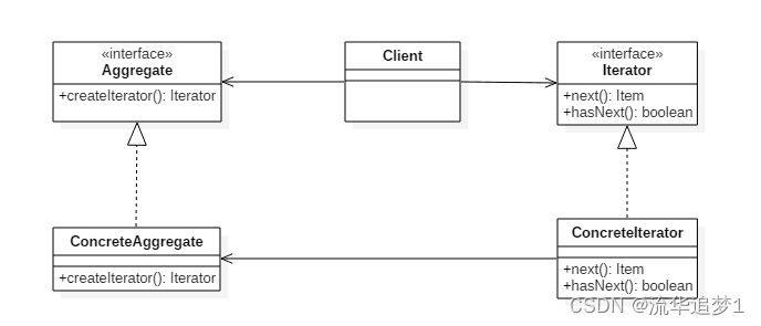 Aggregate 是聚合类,其中 createIterator() 方法可以产生一个 Iterator;