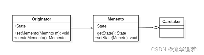 Menento:备忘录,存储原始对象的的状态。备忘录实际上有两个接口,一个是提供给 Caretaker 的窄接口,它只能将备忘录传递给其它对象;一个是提供给 Originator 的宽接口,允许它访问到先前状态所需的所有数据。理想情况是只允许 Originator 访问本备忘录的内部状态。