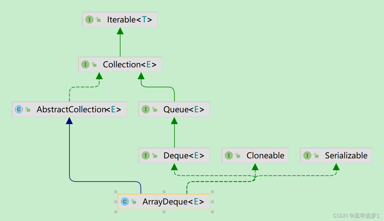 通过继承体系可以看到,ArrayDeque 实现了 Deque 接口,Deque 接口继承自 Queue 接口,它是对 Queue 的一种增强。